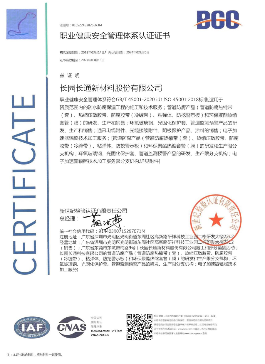 职业健康安全管理体系认证证书